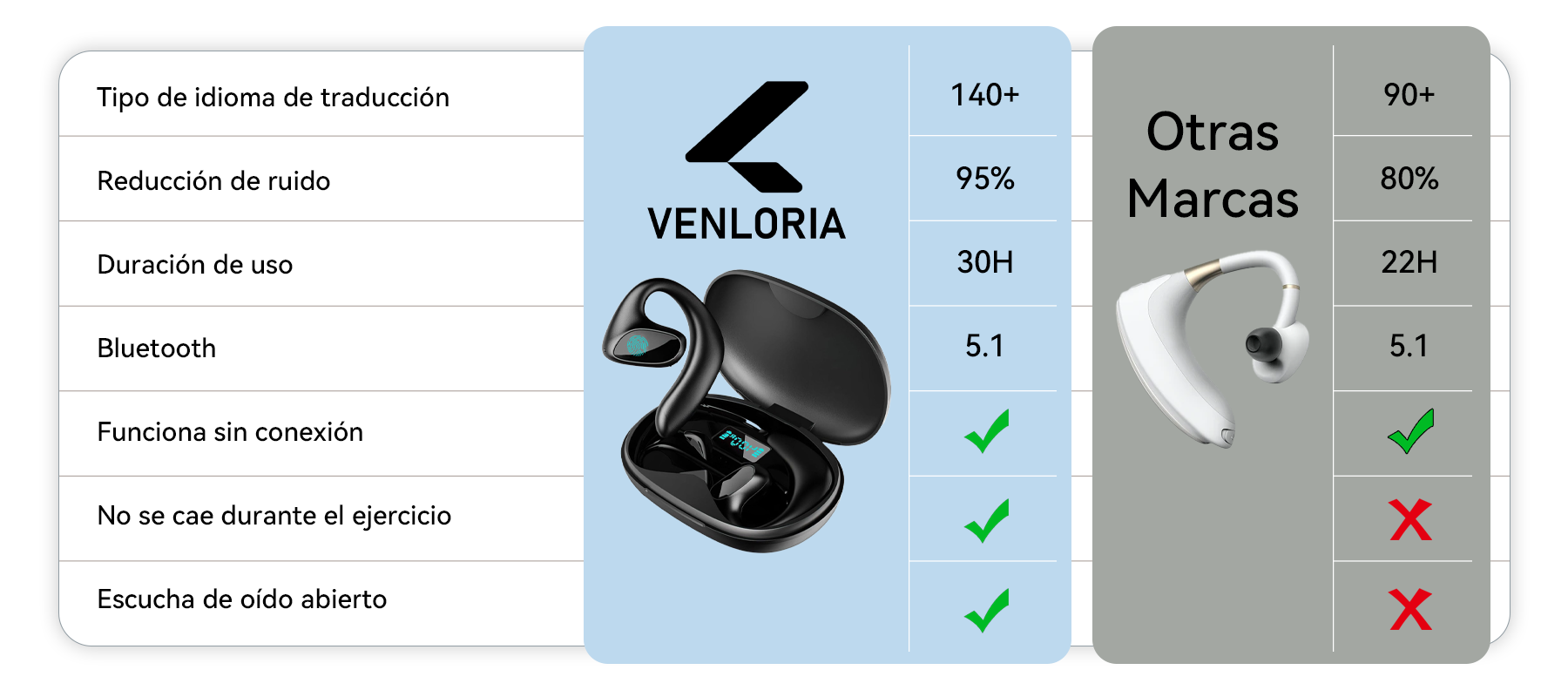 Los Venloria AI Translation Earbuds fueron su respuesta. Ofrecen una precisión milimétrica, una comodidad inigualable para usar todo el día y una experiencia verdaderamente inmersiva. Diseñados para la conexión, porque la comprensión nunca debería verse comprometida.