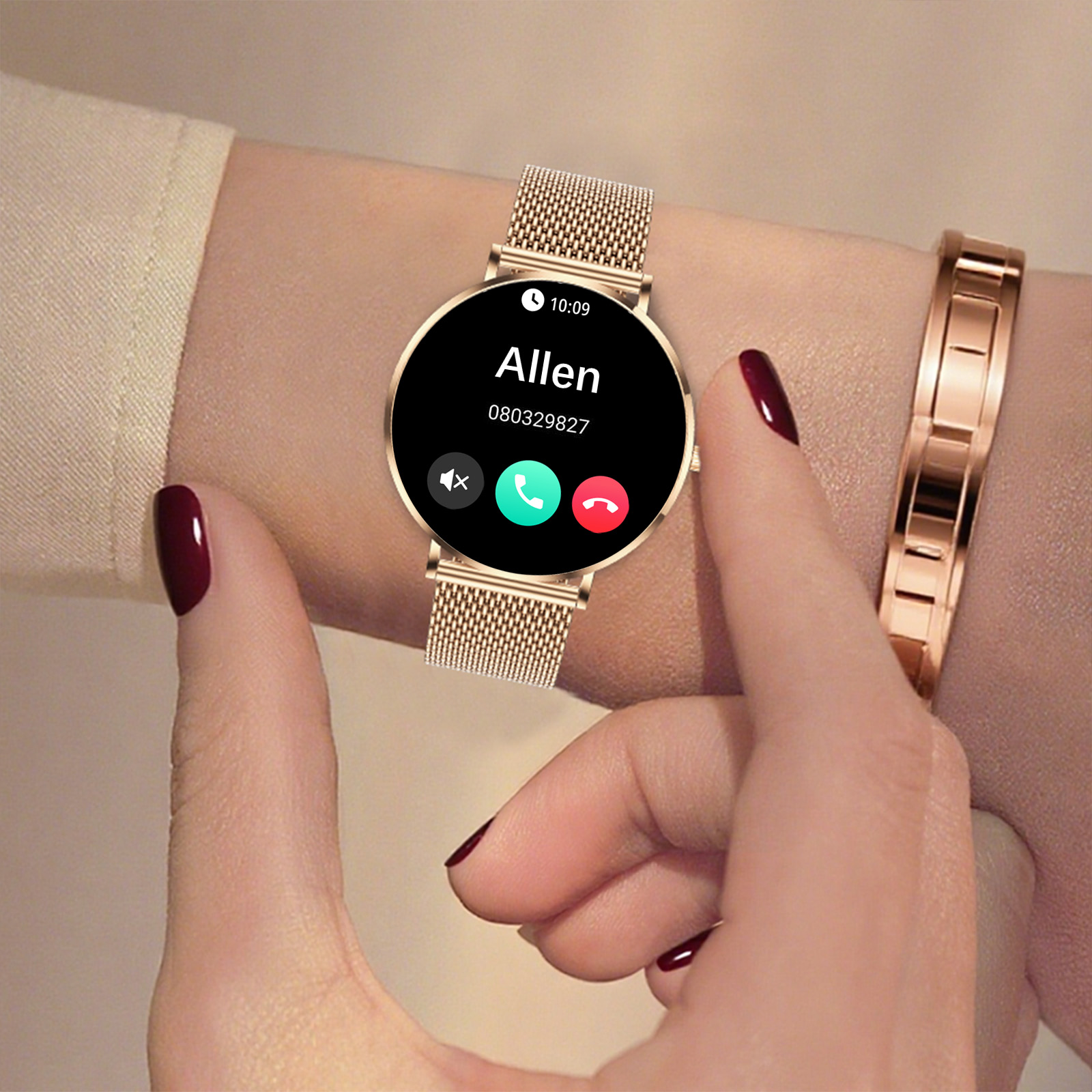El reloj inteligente Venloria combina un seguimiento de salud avanzado con un estilo elegante. Monitorea tu bienestar 24/7, manteniéndose al día con tu ajetreada vida y sirviendo al mismo tiempo como una declaración de moda.